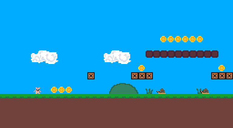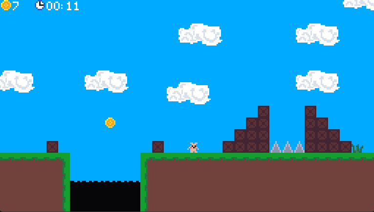 the game features coins, enemies, spikes, trampolines, gnobbler, 4 levels, and a tiny soundtrack i made.